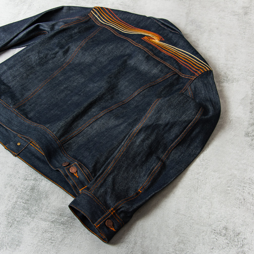 The Nudie Conny Denim Jacket - Sunburns features a striking gradient back yoke embroidery that fades from deep orange to pale yellow, centered by Nudie Jeans Orange. This design creates a bold sunburnt effect across the shoulders, combining classic denim with a unique, eye-catching detail.